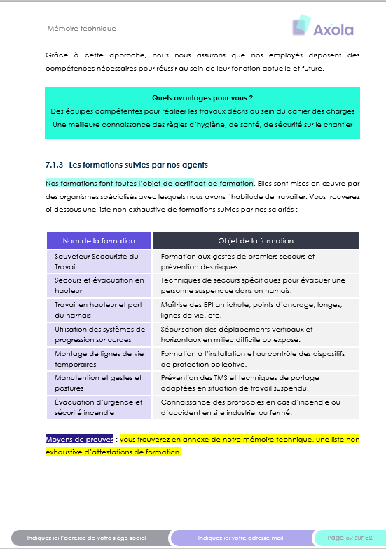 Notre document pré-rédigé par des experts en cordiste vous permet de soumettre une offre technique qui répond précisément aux critères d’évaluation des acheteurs publics francophones (Belgique, France, Luxembourg, Suisse..)