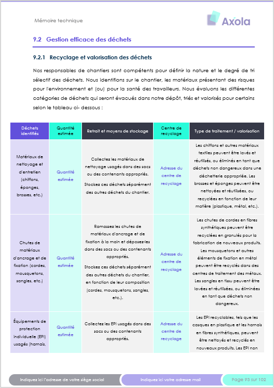 ⏱️ Processus simplifié : Au lieu de rédiger l’intégralité de votre mémoire technique à partir d’une page blanche, vous disposez d’un document professionnel que vous adaptez en quelques heures seulement.