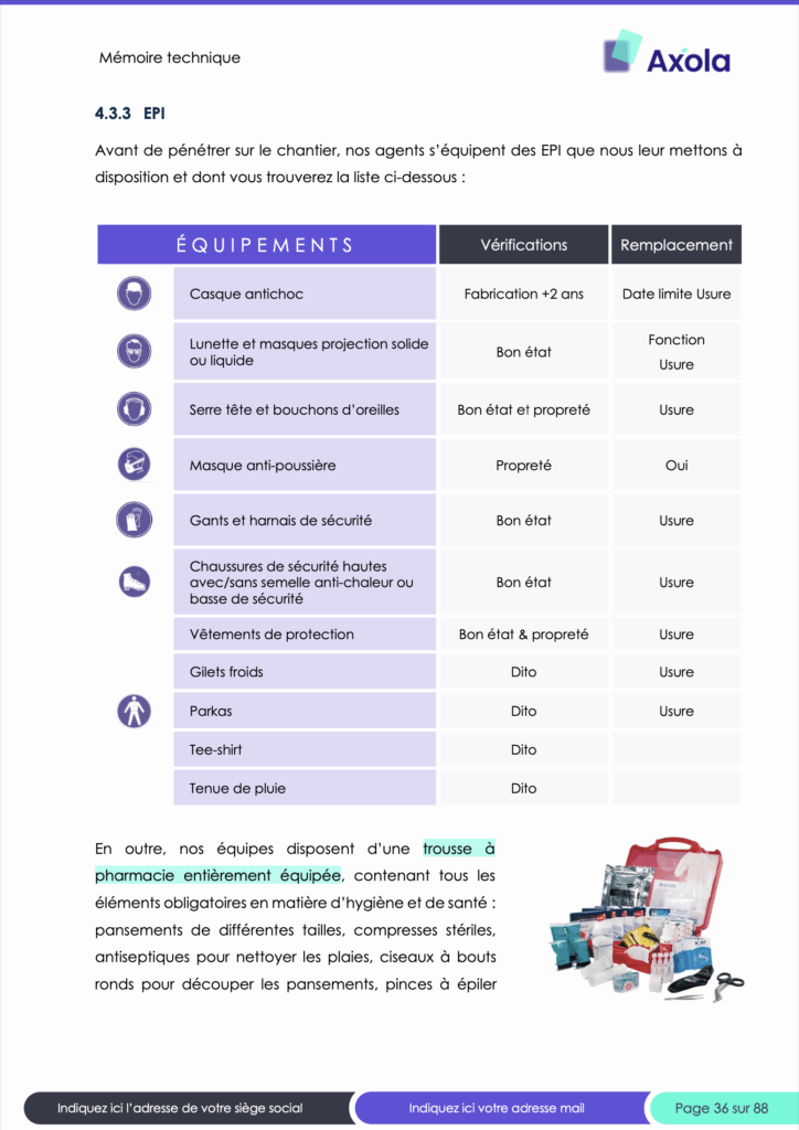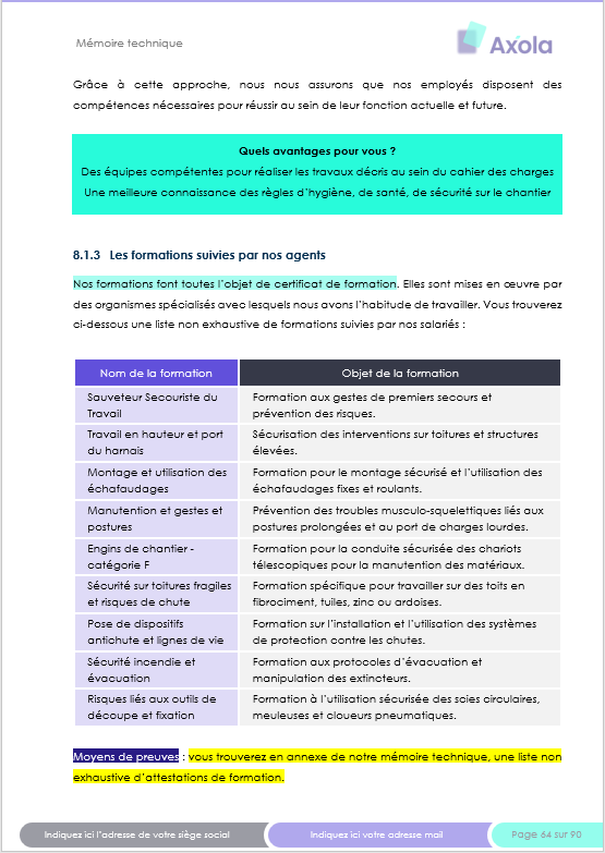 ⏱️ Processus simplifié : Au lieu de rédiger l’intégralité de votre mémoire technique à partir d’une page blanche, vous disposez d’un document professionnel que vous adaptez en quelques heures seulement.