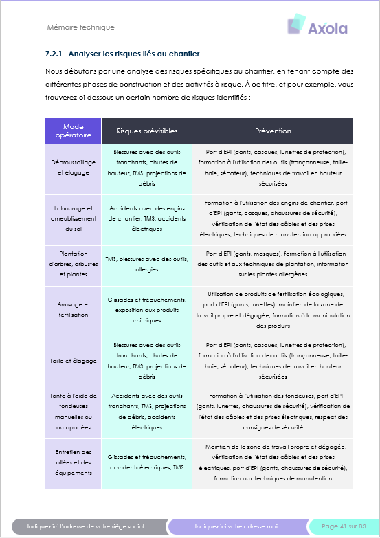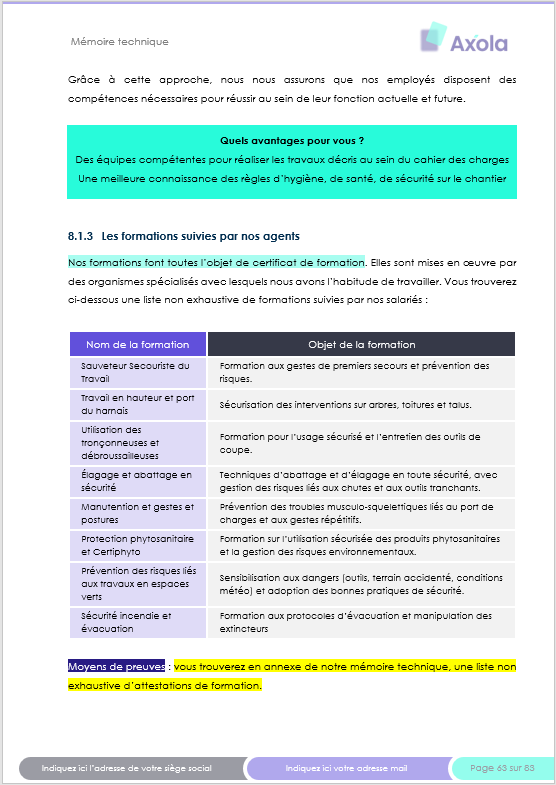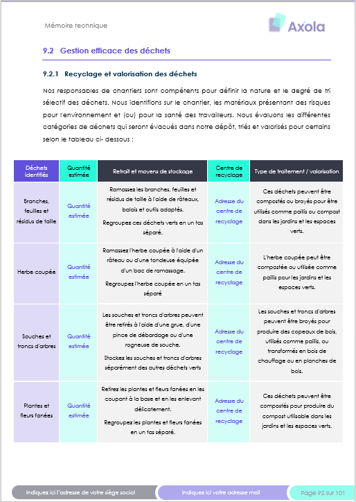 ⏱️ Processus simplifié : Au lieu de rédiger l’intégralité de votre mémoire technique à partir d’une page blanche, vous disposez d’un document professionnel que vous adaptez en quelques heures seulement.