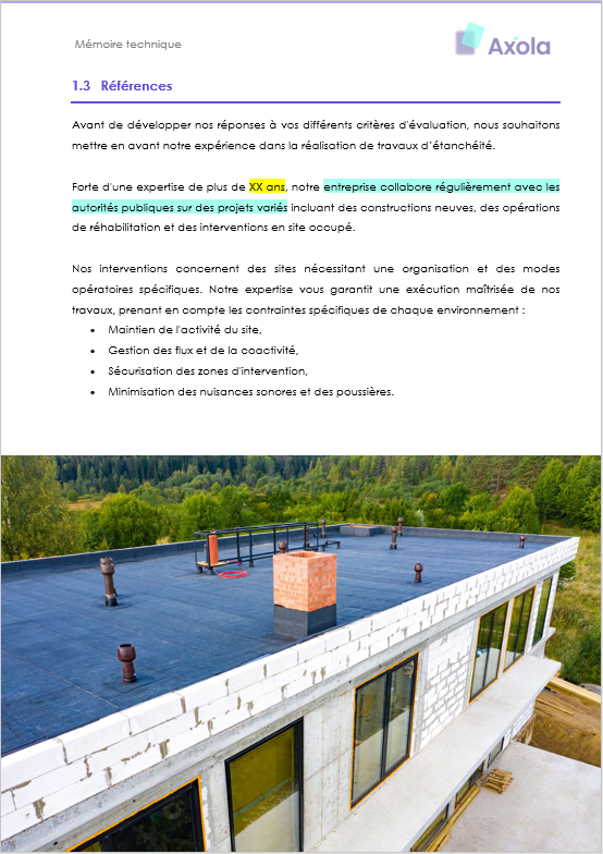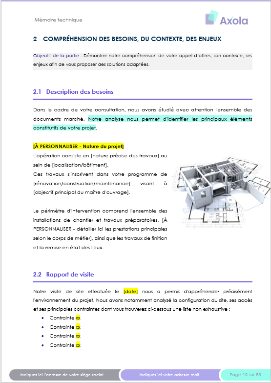 ⏱️ Processus simplifié : Au lieu de rédiger l’intégralité de votre mémoire technique à partir d’une page blanche, vous disposez d’un document professionnel que vous adaptez en quelques heures seulement.