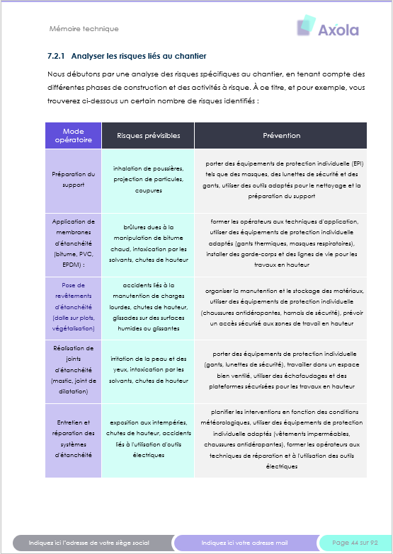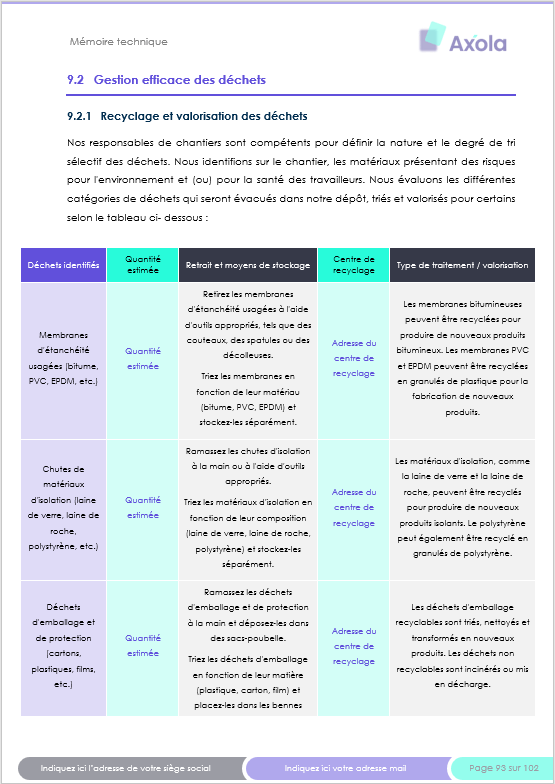 Ce modèle complet de 91 pages couvre l’ensemble des éléments attendus dans un appel d’offres public en étanchéité (moyens humains / techniques, organisation, sécurité, environnement…). Il est parfaitement adapté pour des travaux comprenant notamment :