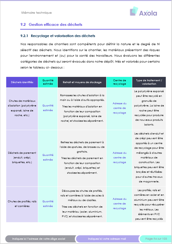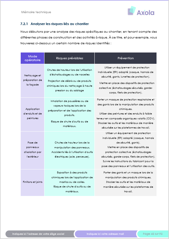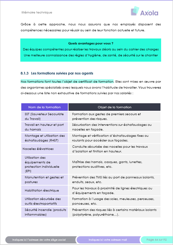 ⏱️ Processus simplifié : Au lieu de rédiger l’intégralité de votre mémoire technique à partir d’une page blanche, vous disposez d’un document professionnel que vous adaptez en quelques heures seulement.