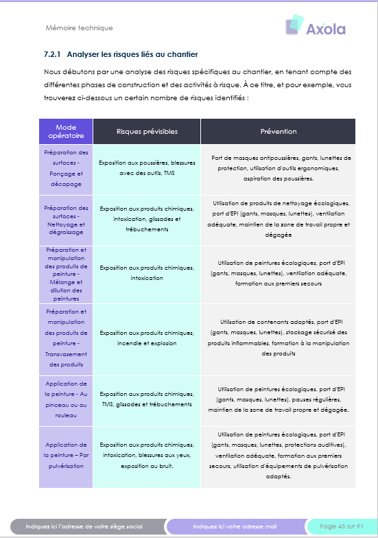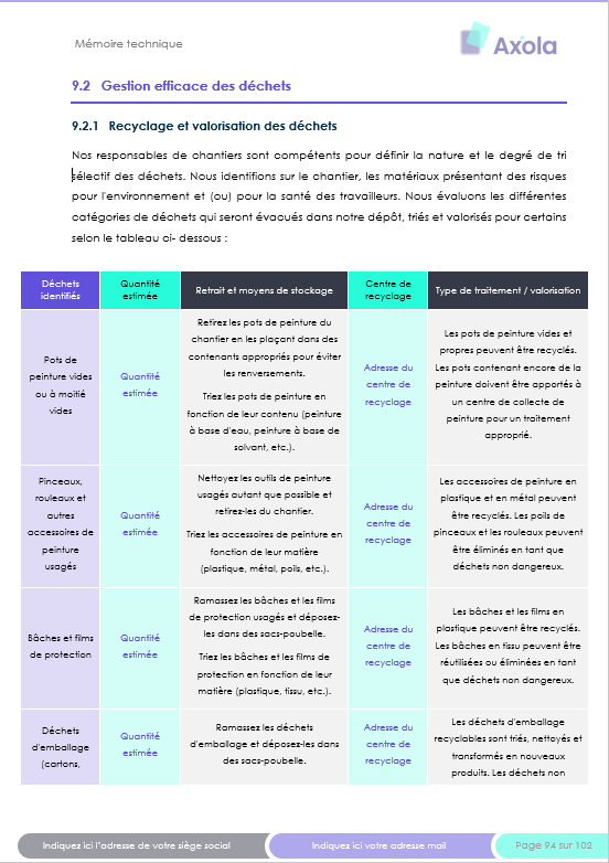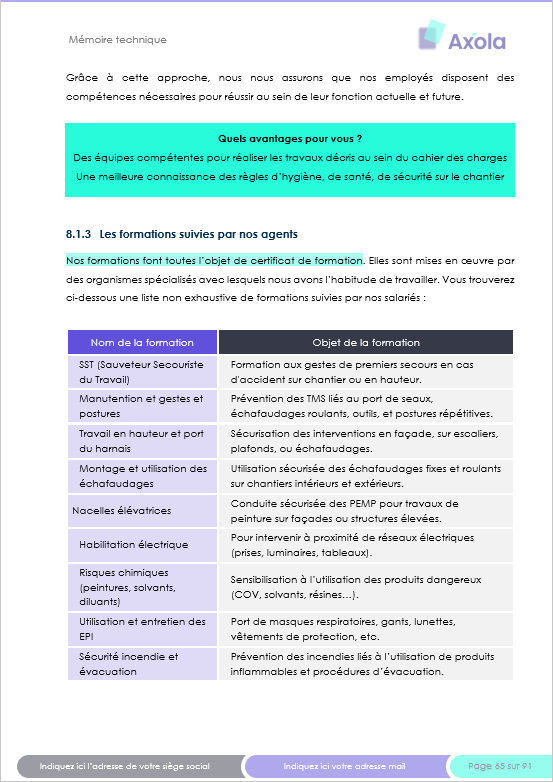 ⏱️ Processus simplifié : Au lieu de rédiger l’intégralité de votre mémoire technique à partir d’une page blanche, vous disposez d’un document professionnel que vous adaptez en quelques heures seulement.