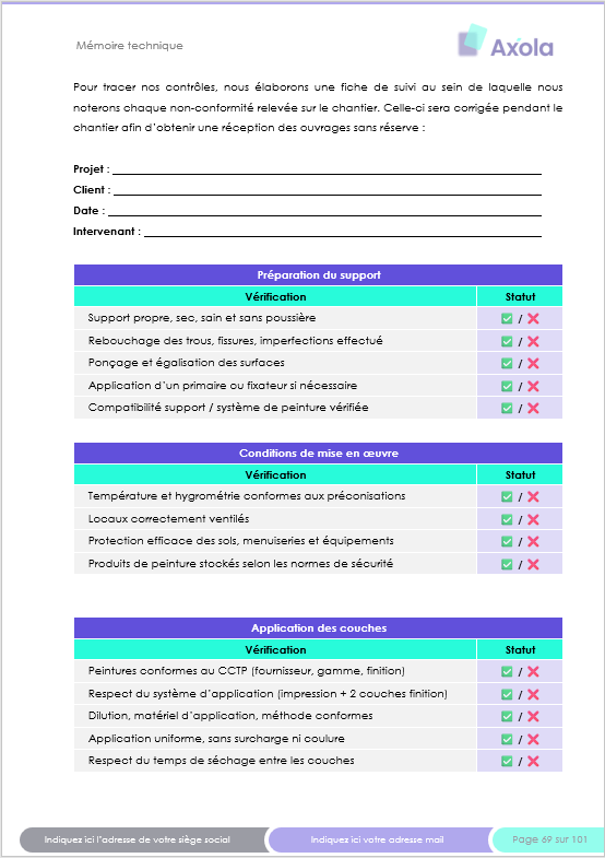 ⚡ Flexibilité maximale : Chaque section de notre mémoire technique est facilement adaptable aux spécificités de chaque appel d’offres, qu’il s’agisse de travaux neufs, de rénovation ou de maintenance, en ajustant les produits, procédés d’application et moyens humains et matériels mobilisés.