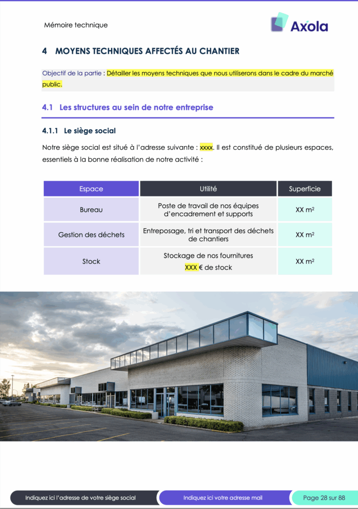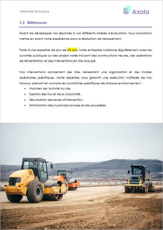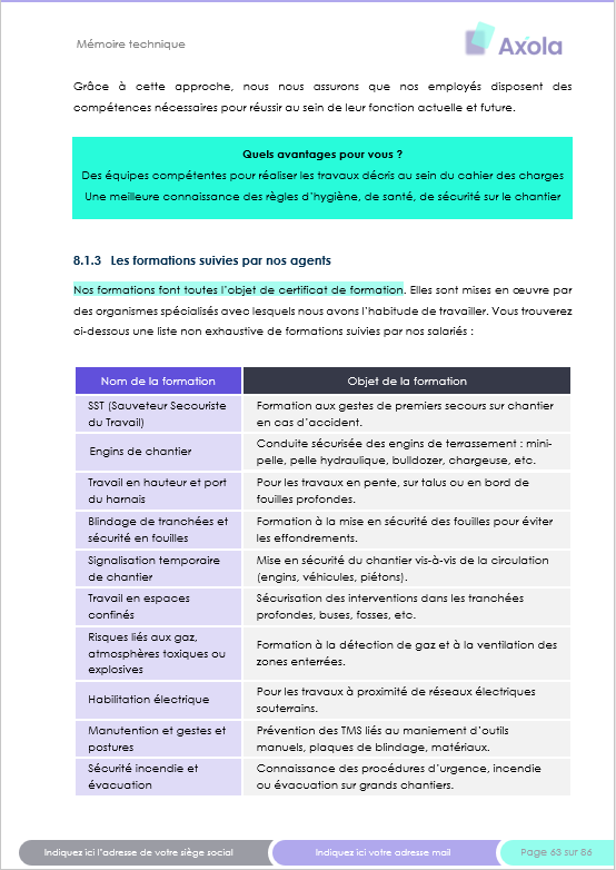 ⏱️ Processus simplifié : Au lieu de rédiger l’intégralité de votre mémoire technique à partir d’une page blanche, vous disposez d’un document professionnel que vous adaptez en quelques heures seulement.